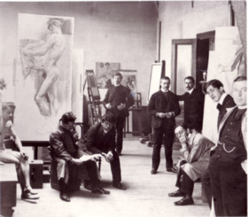 Oskar Kokoschka im Aktsaal der Kunstgewerbeschule, mit Anton Kolig und Prof. Anton von Kenner, 1905