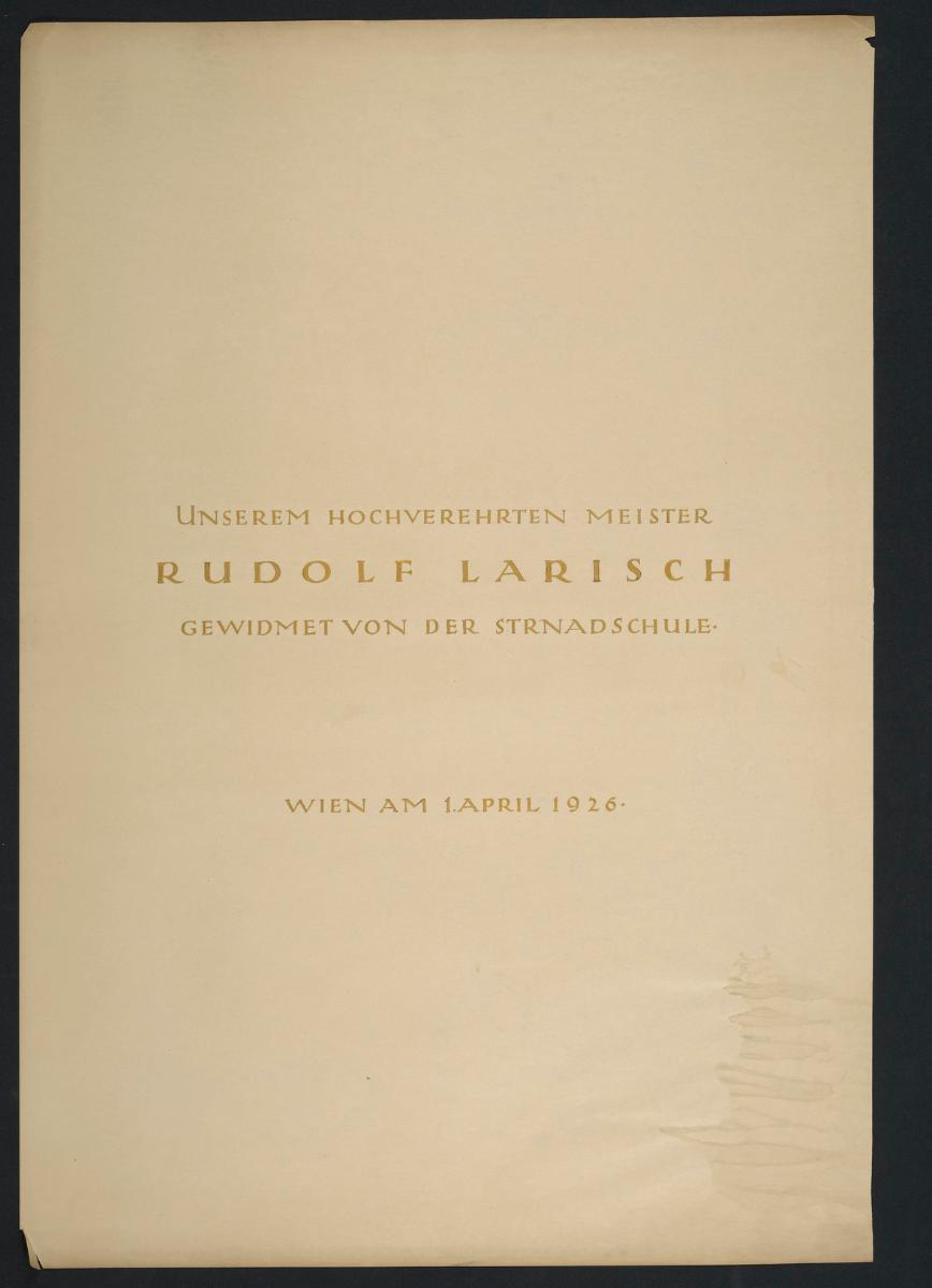 Deckblatt: "Unserem Hochverehrten Meister Rudolf Larisch gewidmet von der Strnadschule, Wien am 1. April 1926"
