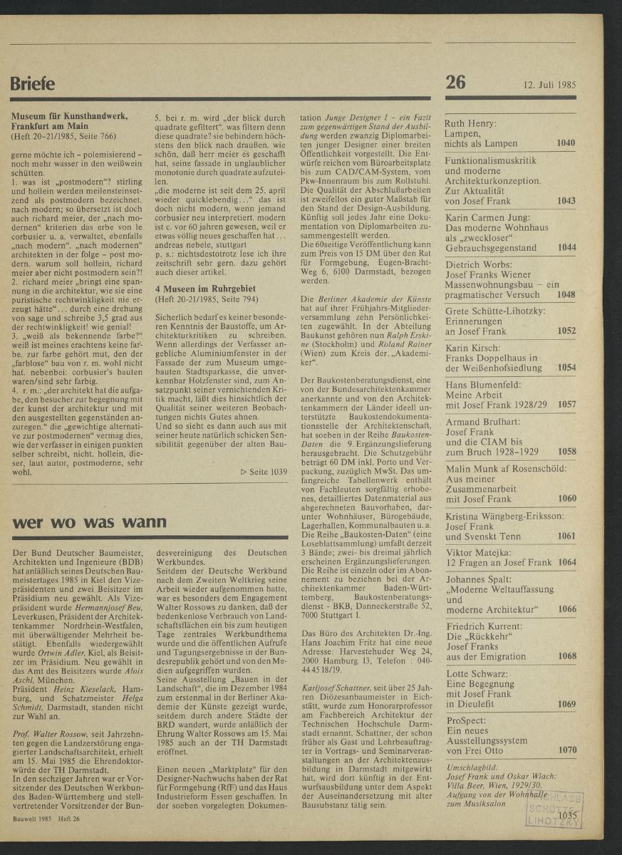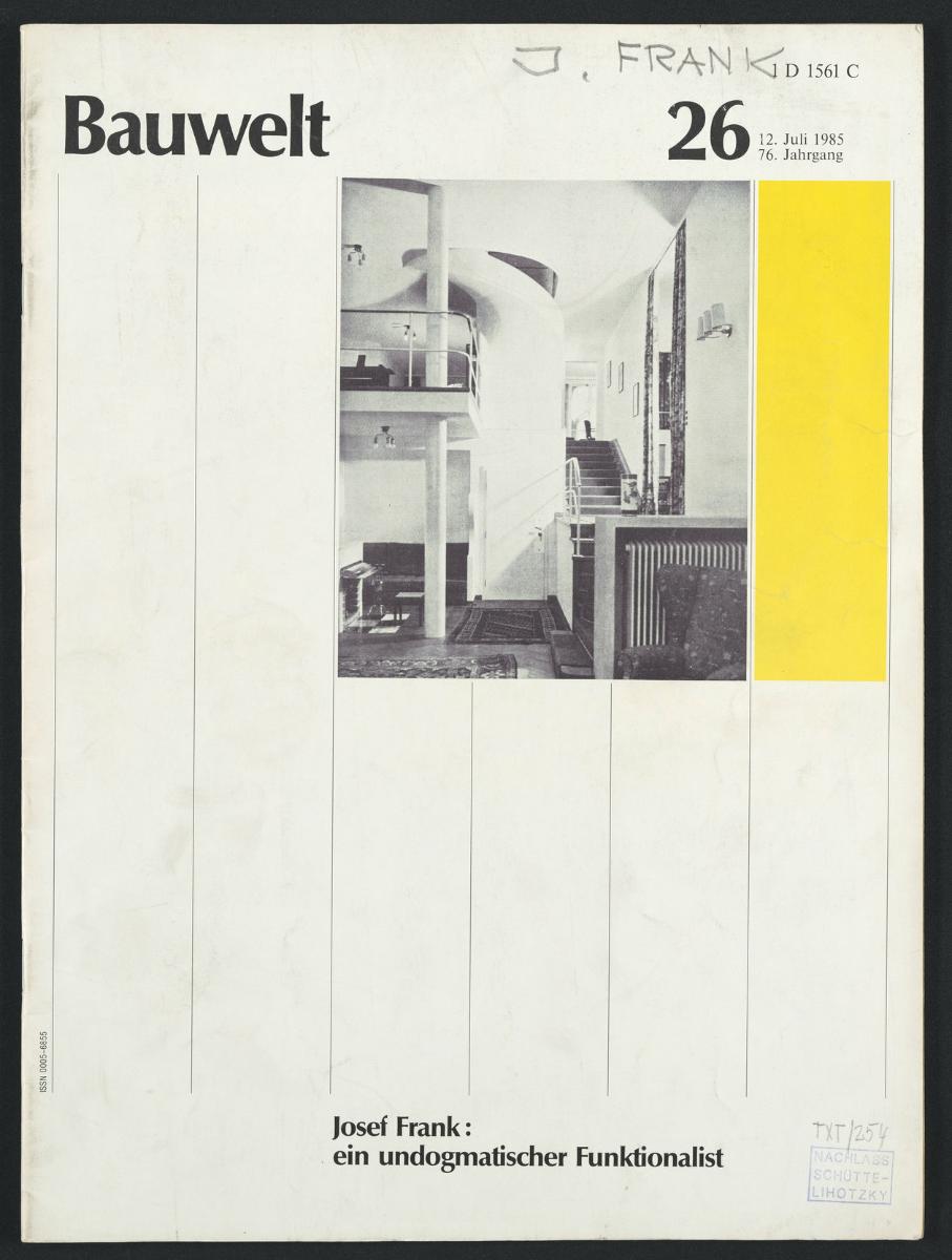 Artikel "Erinnerungen an Josef Frank", in: Bauwelt, Berlin, 1985, S. 1052