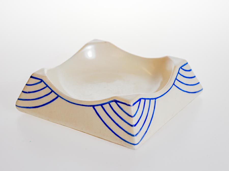 Keramik, weißer Scherben, weiß glasiert, blauer Dekor
