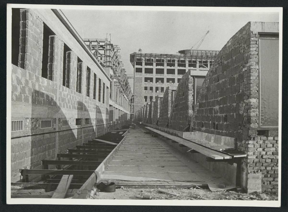 Druckerei und Verlagsgebäude "Globus", Baustelle Sozialtrakt, Hochhaus, Druckerei, Dach